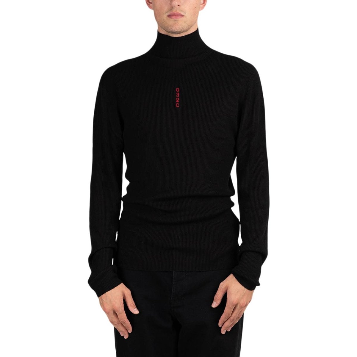 Nahtloser Rippstrick-Rollkragen aus leicht durchsichtigem schwarz mit rotem Logo auf der Brust. Gemütliches Gemisch aus Seide und Wolle.